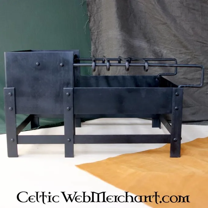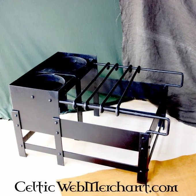 Diese Replik funktioniert genauso wie ein Grill. An der Vorderseite ist der Grill zum Grillen und Braten, auf der Rückseite können die Kurven zum Kochen verwendet werden. Unter dem Kochgestell kann ein Feuer erhitzt werden, es authentisch zu verwenden. Er misst 60 x 45 x 36 und wiegt 18 kg.