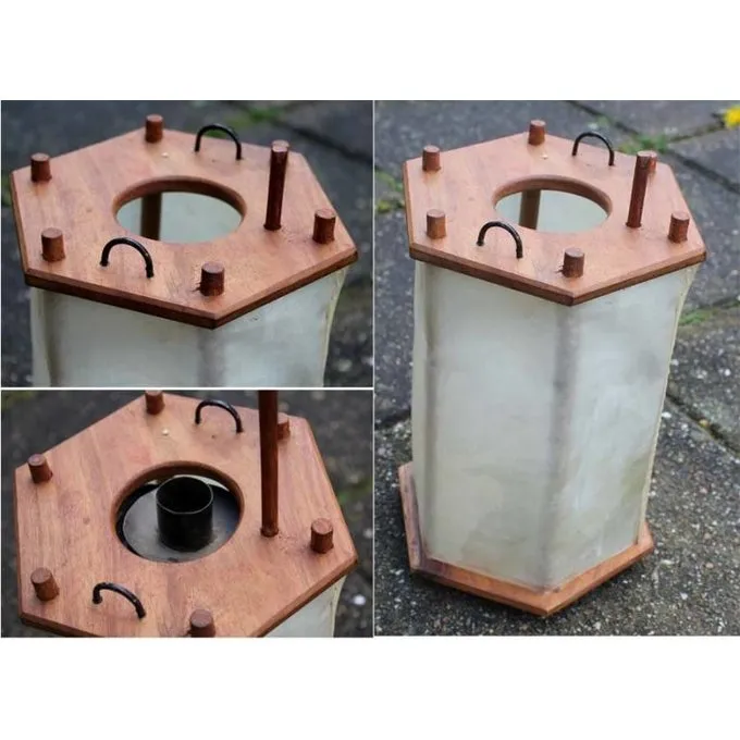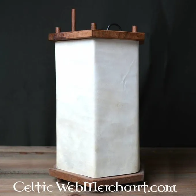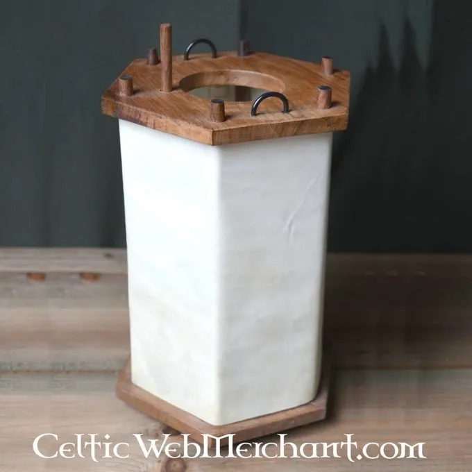 Diese Laterne ist nach einigen frühen mittelalterlichen Originalen. Sie besteht aus einem Holzrahmen mit Fenstern aus Rohhaut, durch die das Licht leuchtet. Laternen wurden häufig wegen Brandschutz verwendet wird.