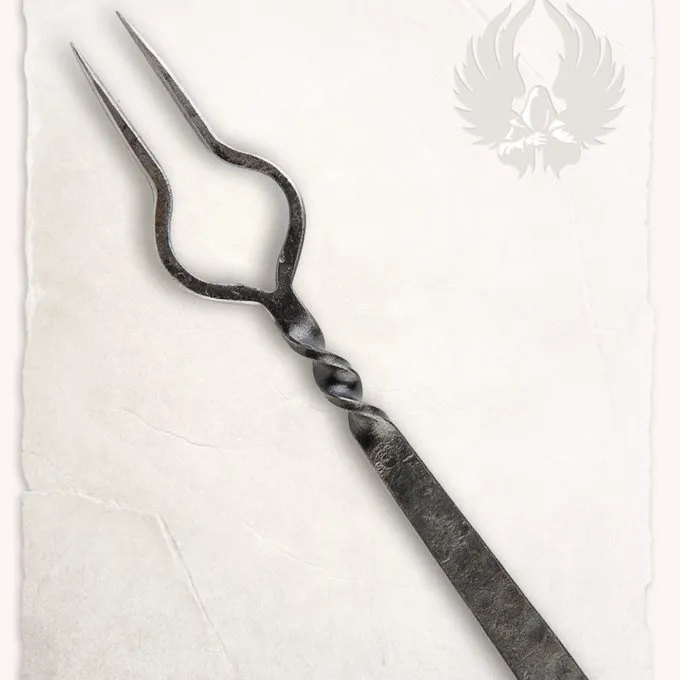 Diese Fleischgabel ist handgeschmiedet aus Kohlenstoffstahl. Die ovale Form der Zähne ist nicht nur dekorativ, sondern macht es auch leichte Stücke Fleisch oder Käse zu durchstechen.