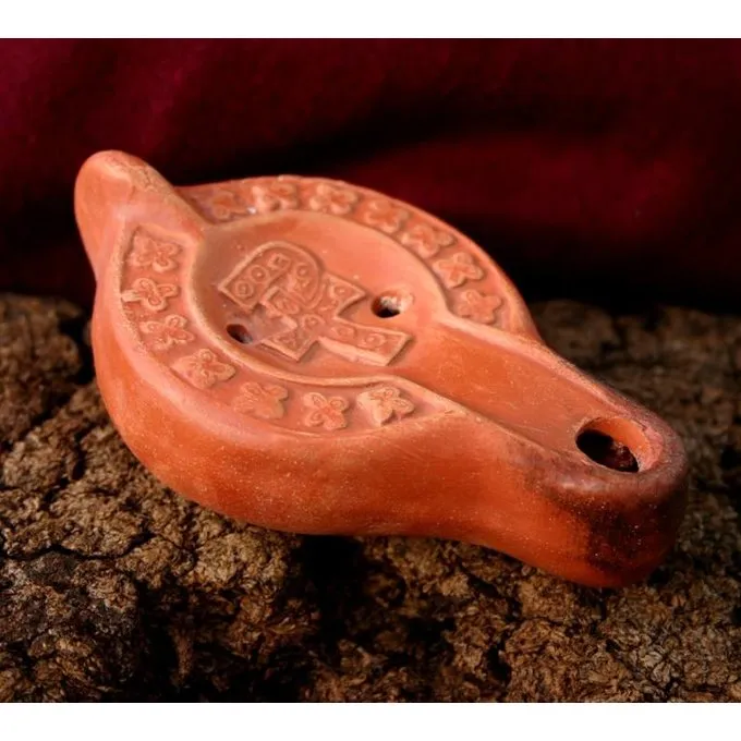 Diese Öllampe ist eine Nachbildung eines Originals aus der zweiten Hälfte des 3. Jahrhundert nach Christus. Um diese Zeit viele Öllampen wurden in den afrikanischen Provinzen des römischen Reiches produziert. Diese Öllampe ist ein Zeichen einer sich abzeichnenden neuen Religion, Christentum. Es ist mit einem Chi-Rho Kreuz verziert. Das Original wurde in Norditalien gefunden, aber ähnliche Lampen wurden in dem ganzen römischen Reich verwendet.