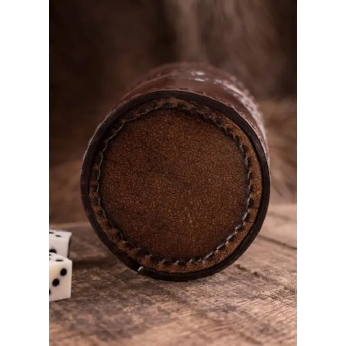 Material: pflanzlich gegerbtes Leder / Farbe braun / Höhe: 9 cm / Durchmesser oben: 7 cm / Durchmesser unten: 6 cm / Dicke: 2-3 mm / Gewicht: 50 g / Lieferung ohne Würfel, werden sie separat verkauft / Auf einem historischen Original basiert